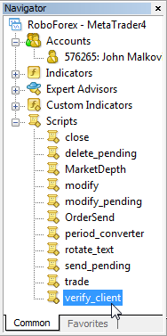 4. После настройки терминала необходимо запустить (дважды кликнуть левой кнопкой мыши) скрипт «verify_client» - он находится во вкладке «Scripts» торгового терминала.
